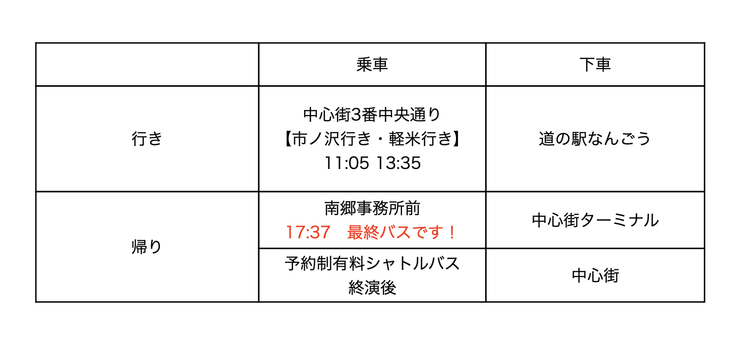 帰りの路線バスは最終バスとなるため、混雑が予想されます。路線バスの所要時間は約40分です。復路のみ、有料シャトルバスの運行を予定しています。チケット販売ページからご予約いただけます。
