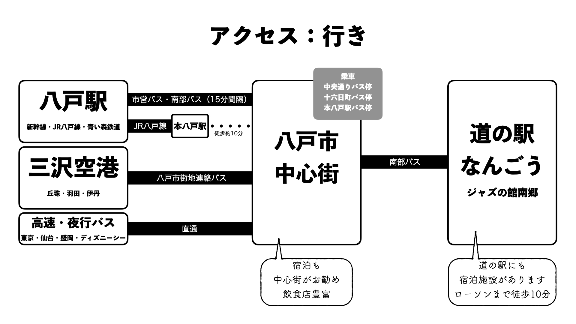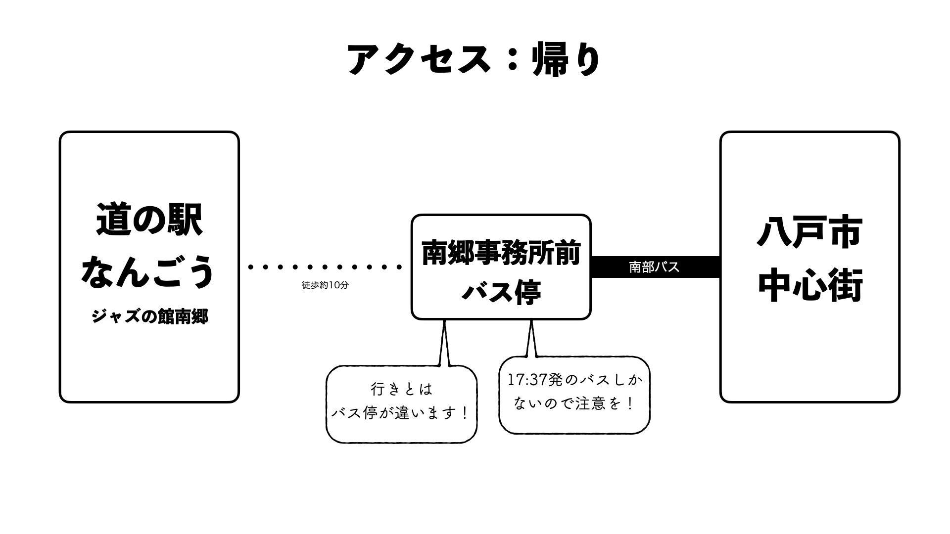 八戸市中心街から、南部バスの路線バスでお越しいただけます。帰りのみ、予約優先の有料シャトルバスを運行します。道の駅なんごうにはレストラン、売店があるほか、周辺には図書館、スーパー、コンビニなどがあります。