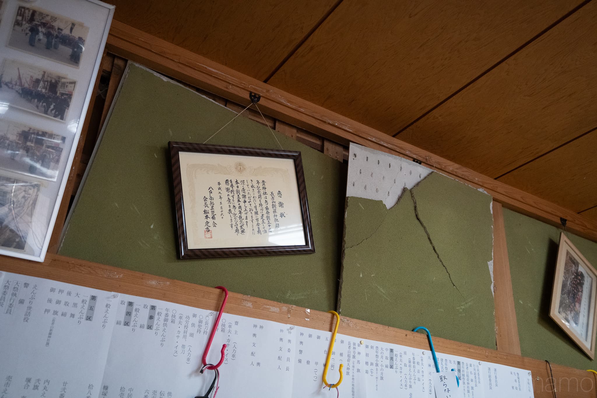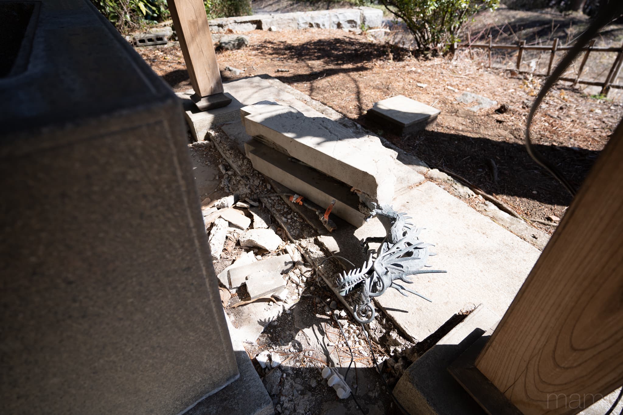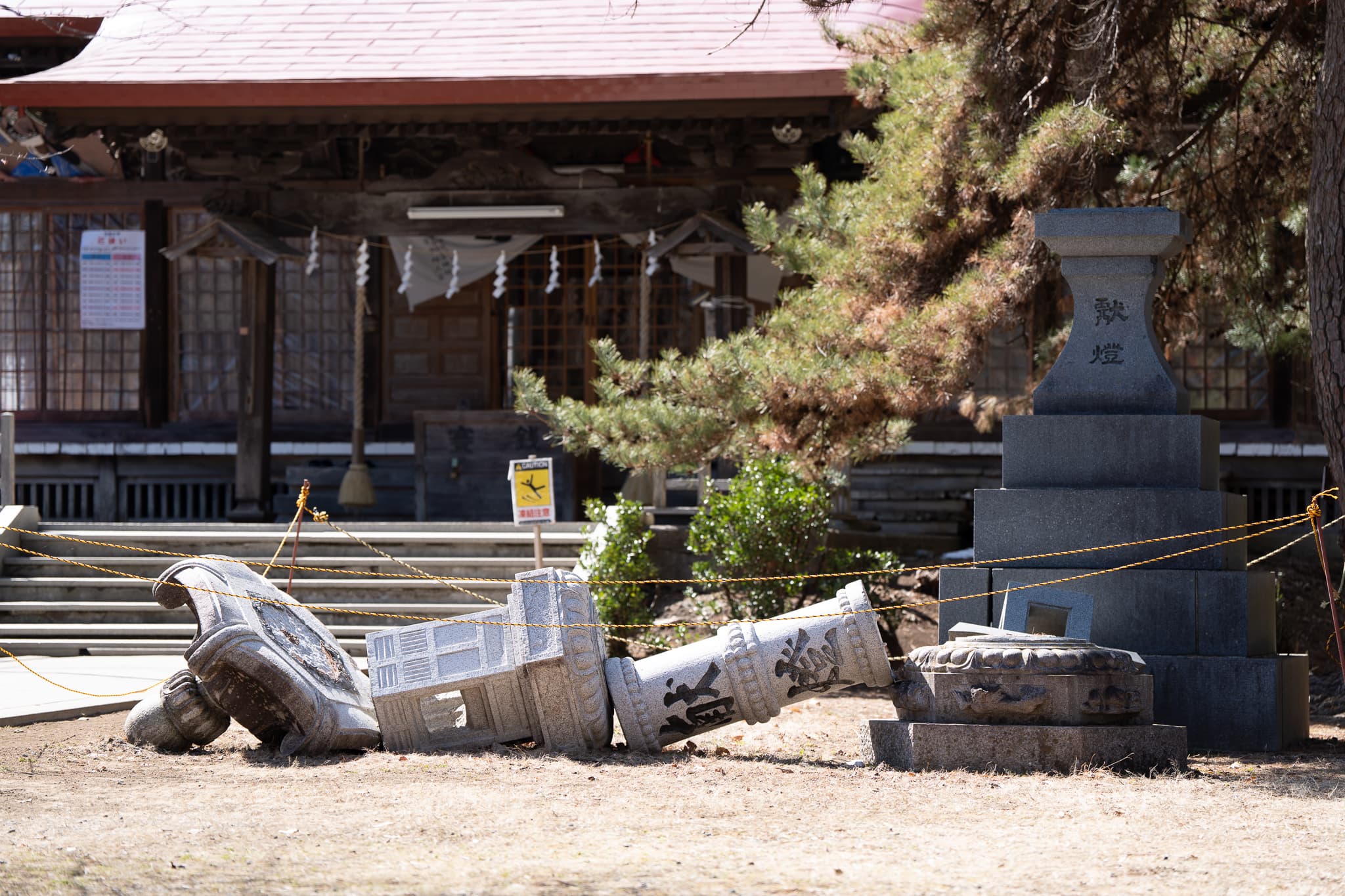 長者山新羅神社は、昨年12月8日に発生した最大震度6強の地震で大きな被害を受けました。境内に4基ある石灯籠は倒れ、狛犬の崩落、手水舎の取水口の倒壊、由緒書き看板も倒れかけています。50畳ほどの大広間を備える集会施設「参集殿」は壁が落ちたりヒビが入ったりしている状況。復旧には1000万円以上が必要とされています。