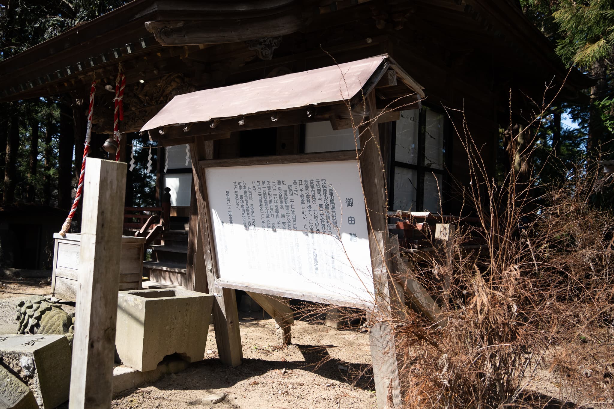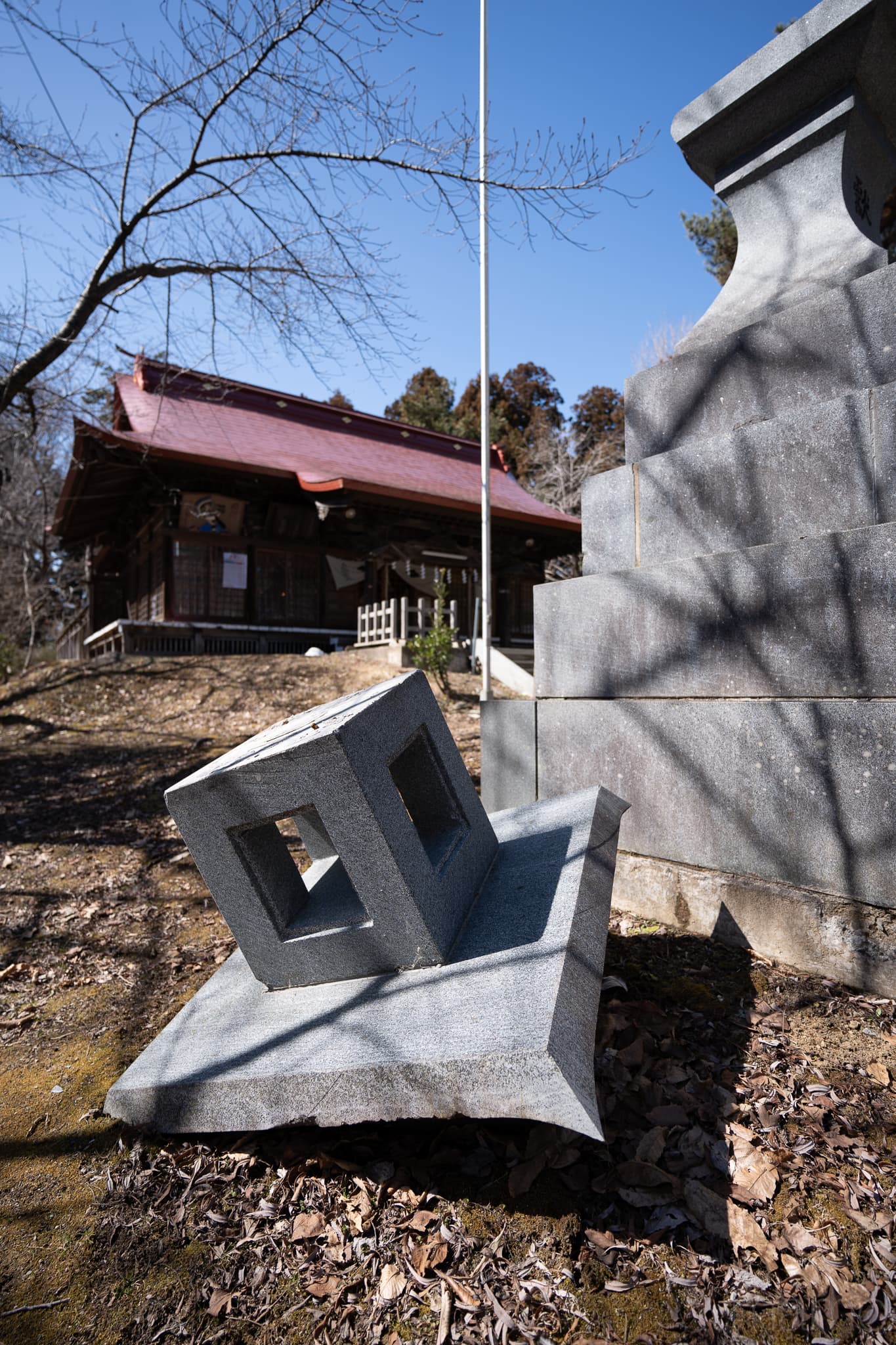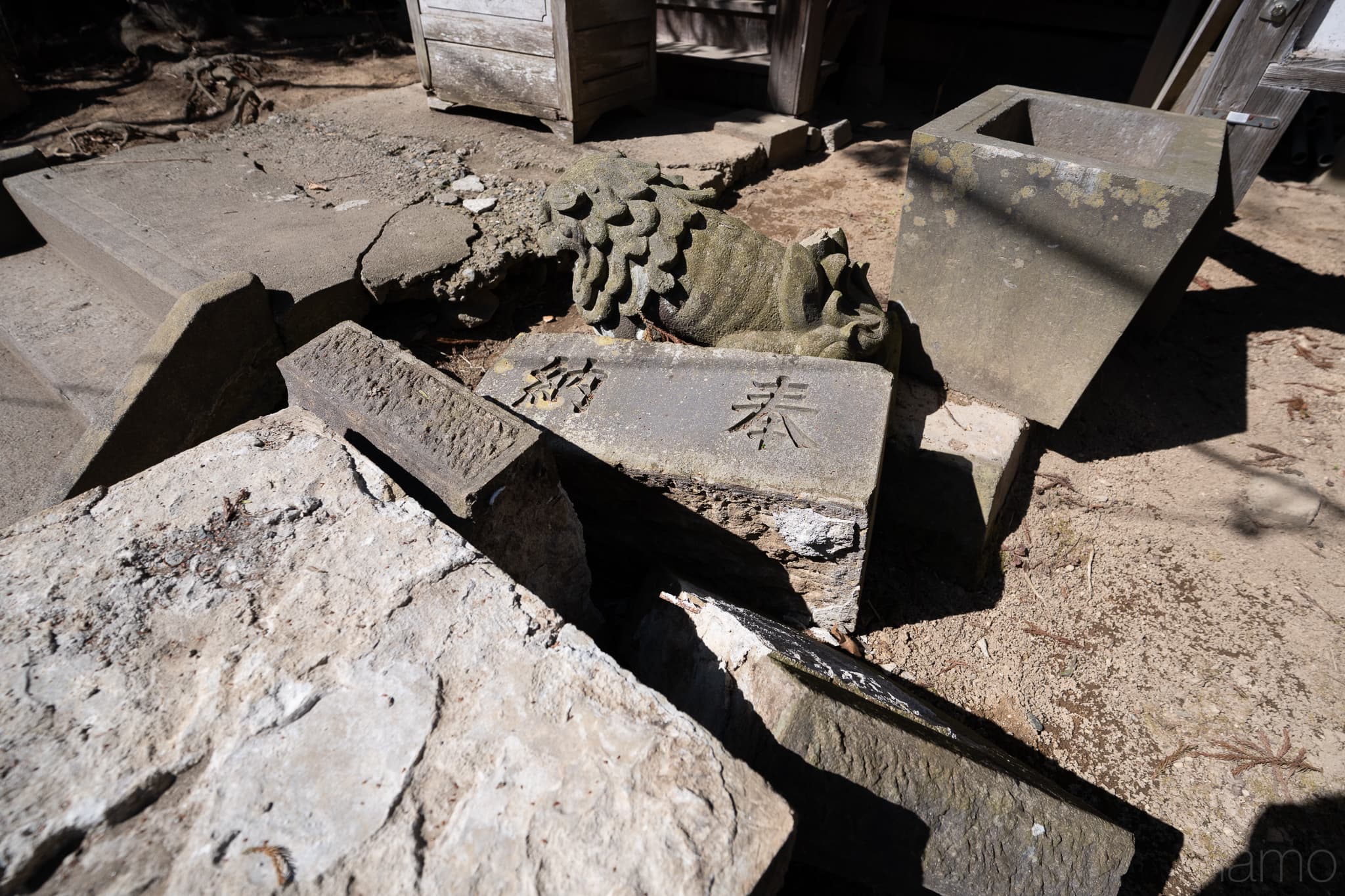 長者山新羅神社は、昨年12月8日に発生した最大震度6強の地震で大きな被害を受けました。境内に4基ある石灯籠は倒れ、狛犬の崩落、手水舎の取水口の倒壊、由緒書き看板も倒れかけています。50畳ほどの大広間を備える集会施設「参集殿」は壁が落ちたりヒビが入ったりしている状況。復旧には1000万円以上が必要とされています。